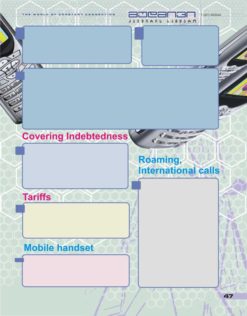 1) According to MagtiCom statutory regulations, any calls (both to fixed and mobile numbers) made within the territory of Georgia are rounded up by 5-second increments of time, while the calls made abroad using the “00” or the “+” code by a 30-second increment.